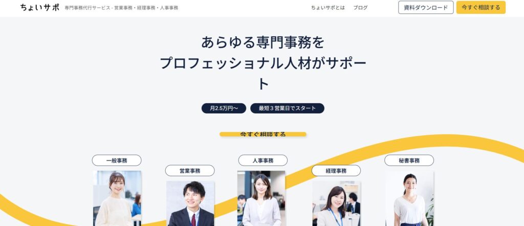 日本エキスパートホールディングス株式会社が運営する「ちょいサポ」は、営業事務・経理・人事・総務など幅広い専門事務を月額2.5万円から利用できるBPOサービスです。