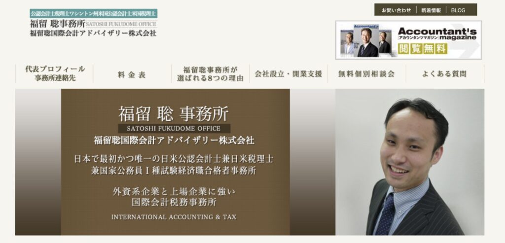 福留聡事務所(福留聡会計アドバイザリー株式会社)は、新宿区と広島市に拠点を構える、日米の税務・会計に精通した国際型会計事務所です。所長の福留聡氏は、日本と米国の公認会計士・税理士資格を持ち、公認不正検査士や行政書士としても活躍しています。