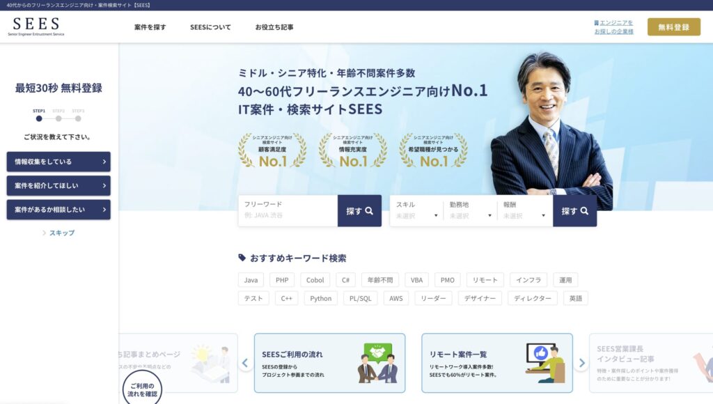 株式会社Miraieの運営するITフリーランスエンジニア向け案件検索サイト「SEES」は、40〜60代のITフリーランスエンジニア向けに特化した案件検索・紹介サイトです。 年齢不問案件を中心に、言語やポジション、勤務地、単価など多様な条件で案件を探すことができます。