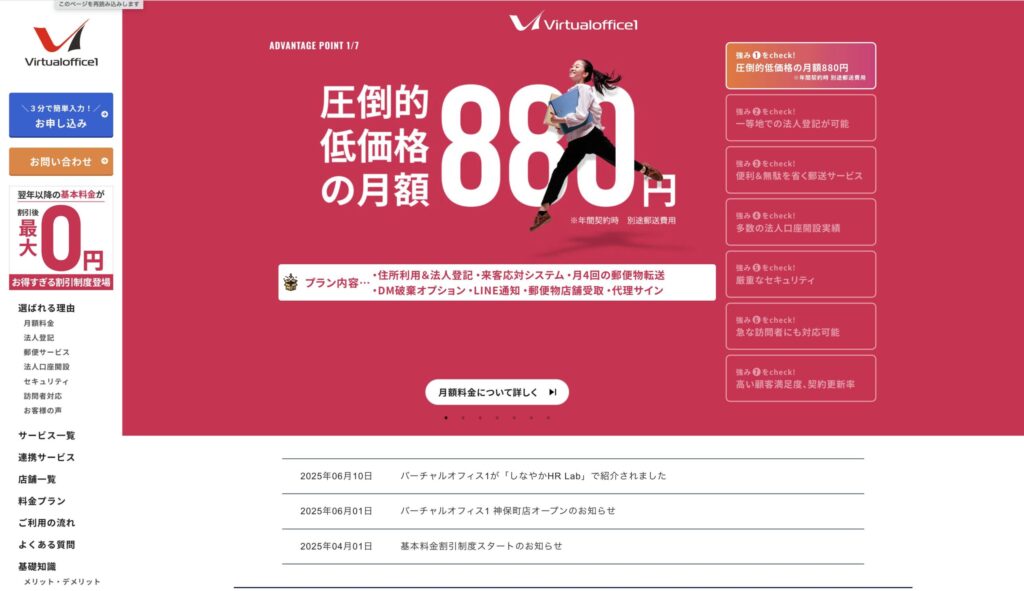 バーチャルオフィス1は、東京都の渋谷区道玄坂、千代田区神田神保町と、広島県広島市中区大手町に拠点を構えるバーチャルオフィスです。