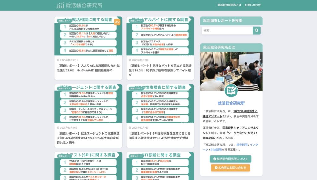 「就活総合研究所」は、就活生を対象にアンケートを実施し、就職活動の実態を分析・発信する情報サイトです。