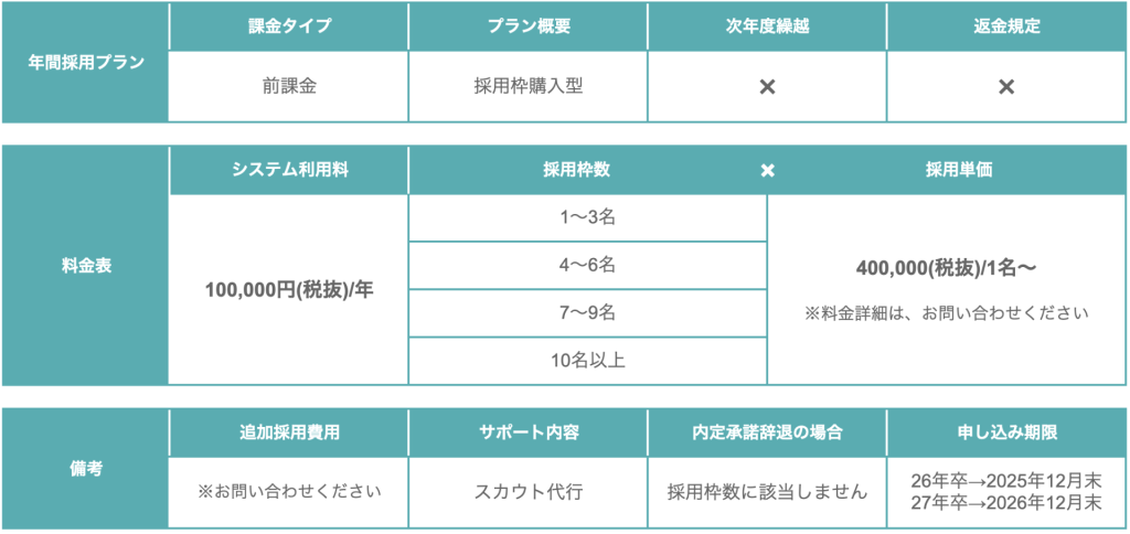 大手人材会社の運営により、サービスの安定性や信頼性が高く、初めてダイレクトリクルーティングを導入する企業にとって安心感があります。母集団形成を重視する企業や、採用人数が多い企業にとってはdodaキャンパスの方が適している可能性があります。