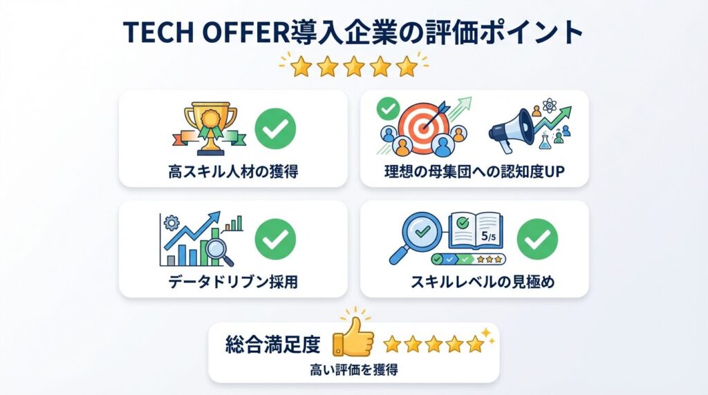 さらに、スキルマッチングの精度が高いことで、学生側も自身の技術を評価してくれる企業として認識してくれるため、志望度の向上にもつながっているようです。技術力を重視した採用を行いたい企業にとって、テックオファーは有効なツールと言えるでしょう。