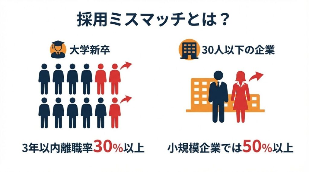 この3割以上という高い離職率は、採用ミスマッチが決して特殊なケースではなく、多くの企業と求職者の間で発生している普遍的な課題であることを物語っています。採用プロセスの見直しと入社後のフォロー体制の強化が、すべての企業にとって重要な経営課題となっているのです。