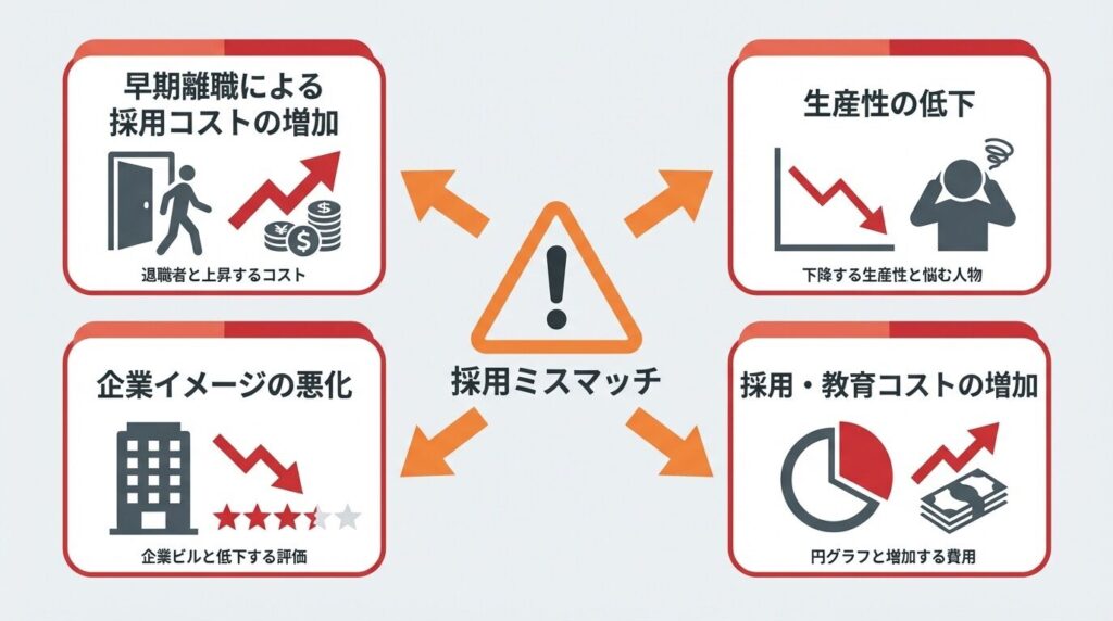 採用活動において「せっかく採用した人材がすぐに辞めてしまった」「期待した成果が出なかった」という経験は、多くの企業が直面する課題です。こうした事態は「採用ミスマッチ」と呼ばれ、企業と従業員双方に大きな損失をもたらします。