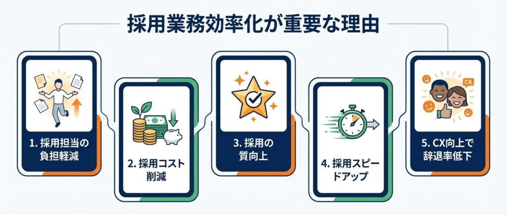 背景には、採用手法の多様化、人材獲得競争の激化、候補者体験の重要性の高まりなど、複数の要因が絡み合っています。ここでは、採用業務効率化が求められる理由を、5つの観点から詳しく見ていきましょう。