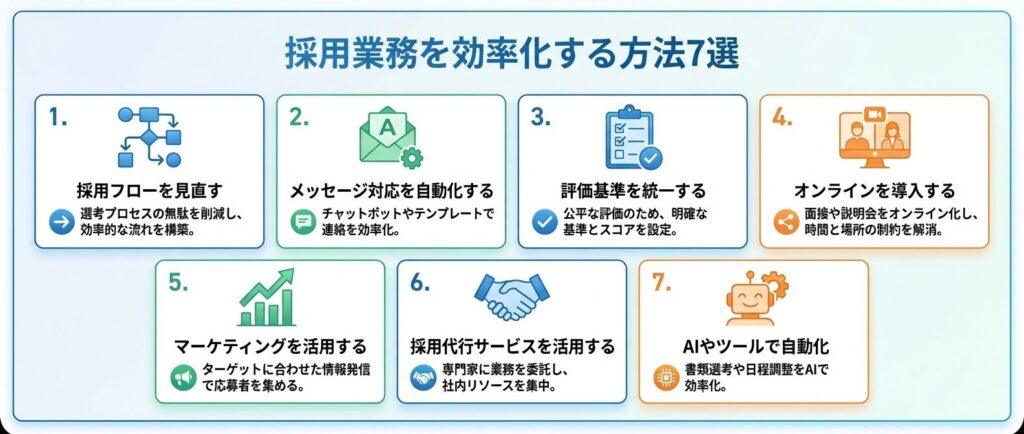 採用フローの見直しから最新技術の活用まで、段階的に取り組むことで、着実に効率化を進めていきましょう。ここでは、実践的で効果の高い7つの方法を詳しく解説します。