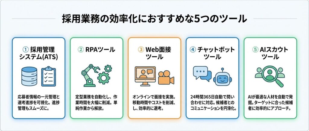 採用業務の効率化を実現するためには、適切なツールの導入が不可欠です。ここでは、採用活動を大きく効率化できる5つのツールについて、それぞれの特徴と活用方法を詳しく解説します。