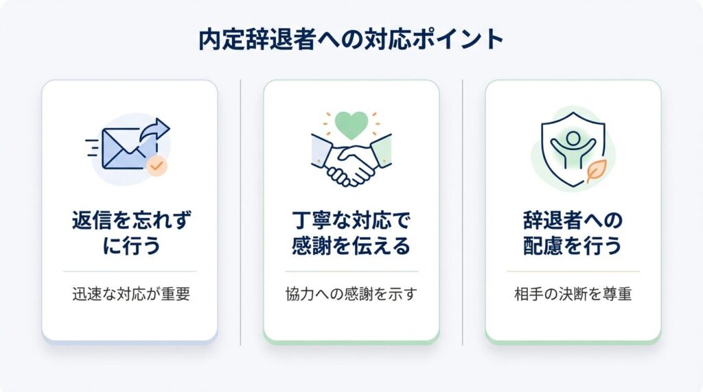 候補者が辞退を決断した際には、無理に引き止めず、その意思を尊重することが第一です。承諾の返信は、感謝の気持ちと今後の活躍を祈る一文を添えることで、誠実な印象を与えることができます。