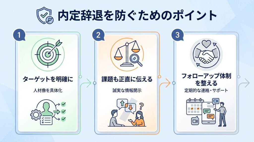 ここでは、候補者が安心して入社を決断できるようにするための3つのポイントをご紹介します。実践することで、辞退のリスクを減らし、採用の成功率を高められるでしょう。