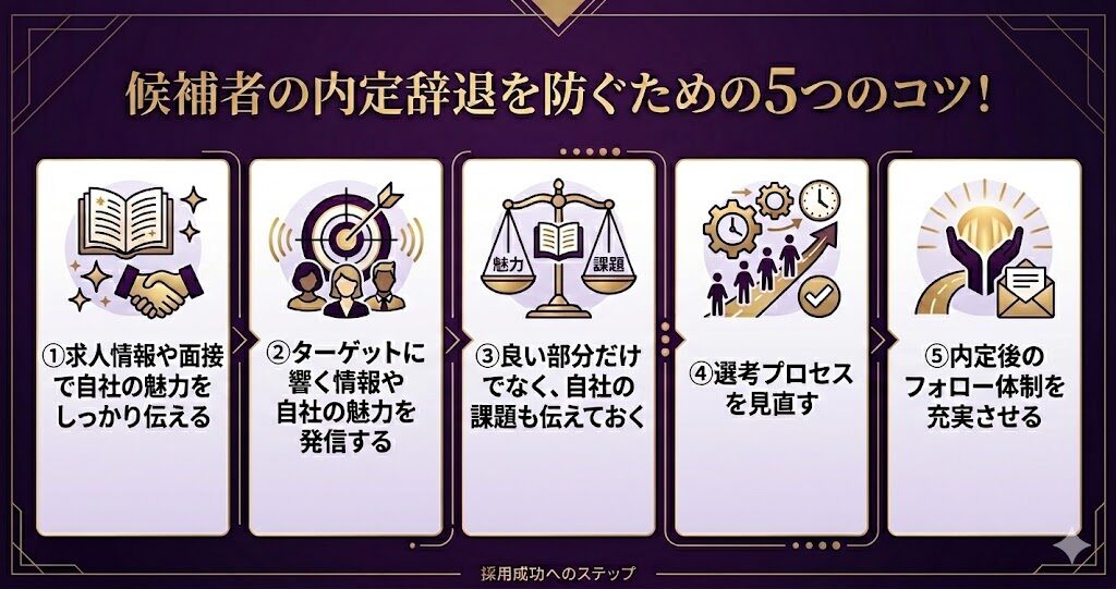 この章では、内定辞退を未然に防ぐために採用担当者が実践できる5つのコツを整理しています。
