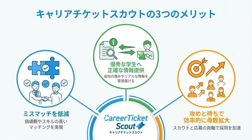 口コミや評判を踏まえて、キャリアチケット就職スカウトを導入することで得られるメリットを整理してみましょう。