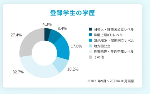 学歴の内訳を見ると、GMARCH・関関同立レベル以上の学生が約35%、地方国公立が約33%、日東駒専・産近甲龍レベルが約27%となっています。