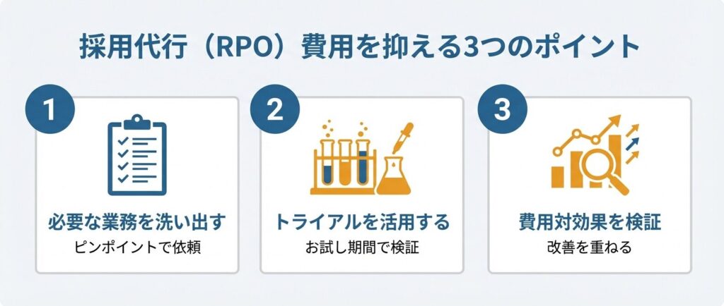 必要な業務だけをピンポイントで依頼できるため、採用活動の一部のみ外注したい企業や、業務量が読みにくい時期に適しています。一方で、業務量が増えると費用も比例して増加するため、大量採用を行う場合は注意が必要です。