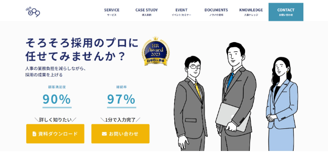 面接代行・採用コンサルティングに定評のあるサービスで、選考フローの設計から面接官のトレーニングまで、選考の質を高めるための支援に強みを持ちます。採用代行の中でも特に「選考プロセスの精度を上げたい」というニーズを持つ企業から支持されています。