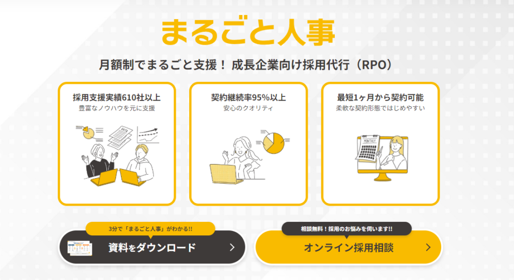 まるごと人事は、マルゴト株式会社が提供する月額定額型の採用代行サービスです。成長企業やスタートアップを中心に、610社以上の採用支援実績を持ちます。