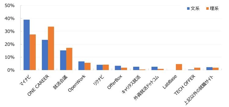 図は文理別に最も活用している就活サイトのTOP10を示したものです。ワンキャリアは文系で2位、理系では1位にランクインしており、理系学生へのリーチという点では他のどの媒体よりも優位性があります。