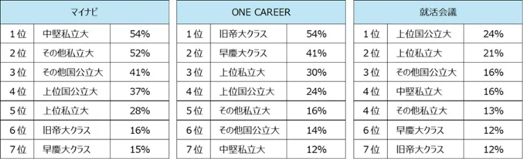 東大・京大をはじめとする上位校・旧帝大・早慶・MARCHクラスの学生の利用率が非常に高く、就活に積極的な意欲的な層が多いことが特徴です。