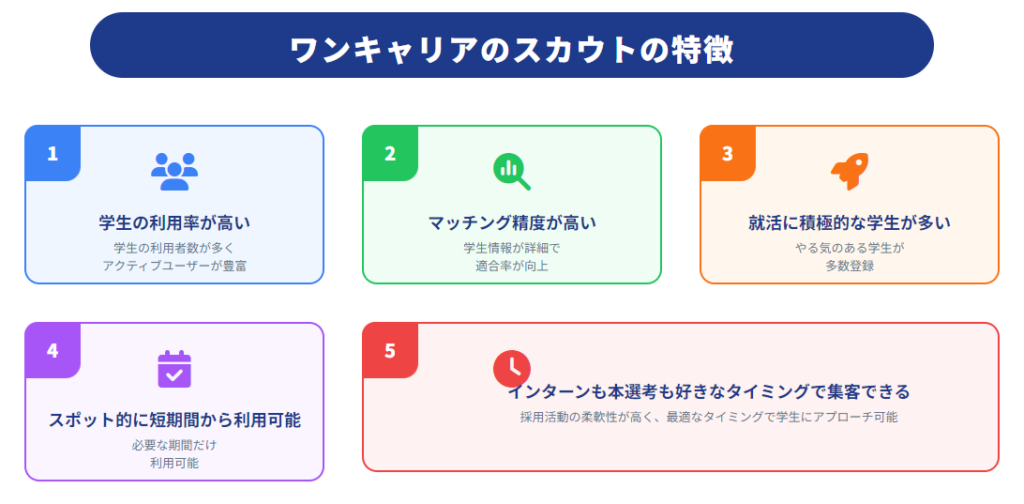 採用ツールを選ぶ際に最も気になるのは、「そのサービスを使うことで自社の採用が本当に変わるのか」という点ではないでしょうか。ワンキャリアのスカウト機能にはいくつかの特徴があり、それを正しく理解することが活用の前提となります。