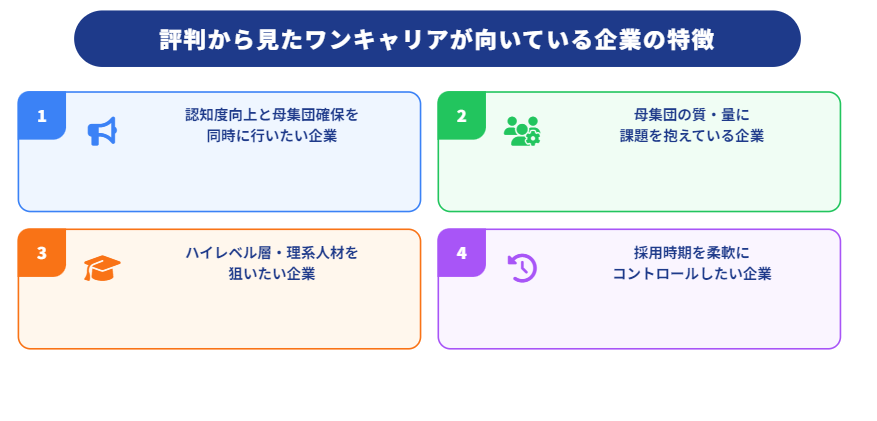 「応募は来るが、求めているレベルに届かない」「そもそも応募数が少ない」という両面の課題を抱えている企業に向いています。ワンキャリアのスカウト機能で自社にマッチした学生に直接アプローチすることで、母集団の量を確保しながら質も高めるアプローチが可能です。