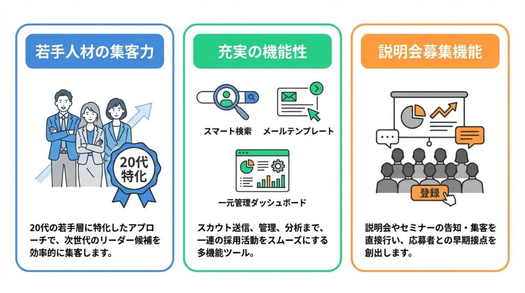 このサービスは単なるスカウト機能だけでなく、説明会への直接募集機能なども備えており、採用プロセス全体の効率化を支援します。求人票を掲載して応募を待つのではなく、企業側が主導権を持って採用活動を進められる点が大きな魅力です。