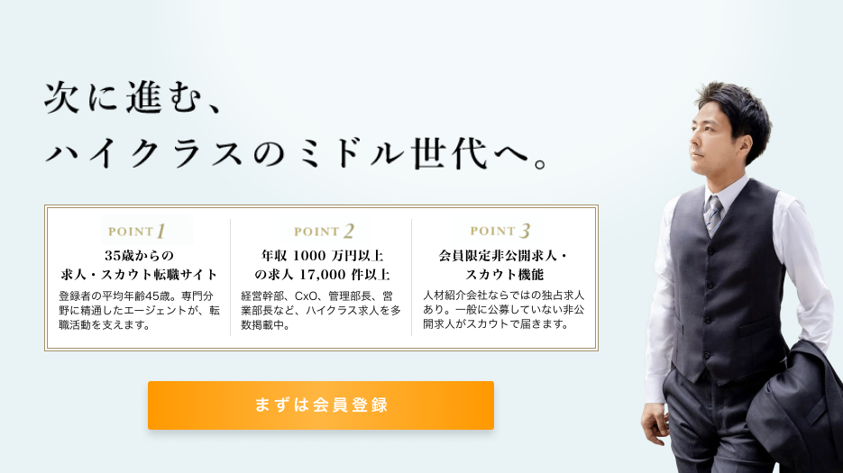 ビズリーチは年収600万円以上のハイクラス層を中心としているのに対し、ミドルの転職は30代以上という年齢層に焦点を当てており、必ずしも高年収層のみに限定していません。