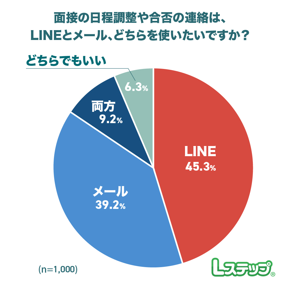 Lステップが1,000名の就活生を対象に実施した調査では、面接の日程調整や合否の連絡にLINEを使いたいと回答した学生が45.3%と最多でした。メール希望の39.2%を上回っており、「両方」(9.2%)「どちらでもいい」(6.3%)を加えると、LINEに対応していることへのニーズは非常に高い水準にあることがわかります。