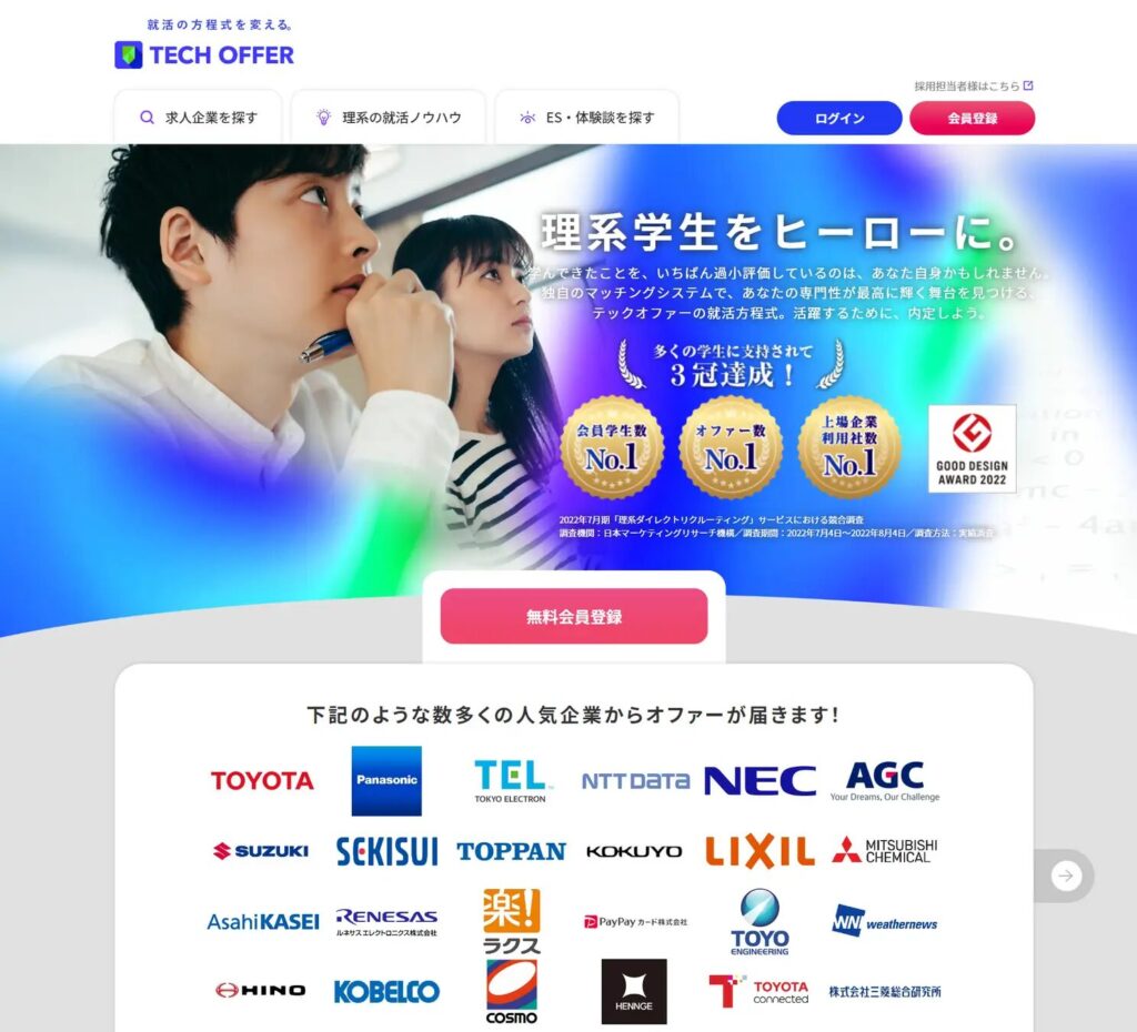 TECH OFFER(テックオファー)は、理系学生に特化したスカウト型就職サービスです。株式会社テックオファーが運営しており、理系修士・博士課程を中心とした専門性の高い学生が多数登録しています。エンジニアや研究職、技術職の採用を強化したい企業にとって、効率的に理系人材と出会えるプラットフォームとなっています。