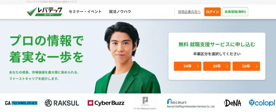 レバテックルーキーは、レバレジーズ株式会社が運営するITエンジニア特化型の新卒就活エージェントです。エンジニア採用に特化しており、プログラミング経験のある学生や情報系専攻の学生が多数登録しています。IT企業やWeb系企業にとって、即戦力に近い新卒エンジニアと出会える貴重なサービスとなっています。