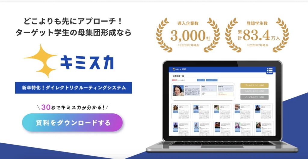 株式会社グローアップが運営する『キミスカ』は、就活生の3人に1人が利用している新卒向けダイレクトリクルーティングサービスです。学生と企業の双方にとって使いやすい設計がされており、スカウト型採用の中でも特に実践的なツールとして多くの企業が導入しています。