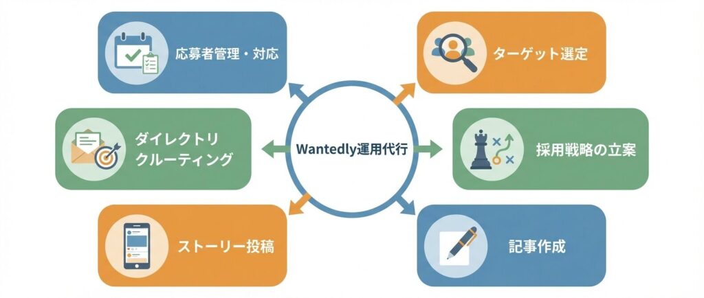 それでは、Wantedlyの運用代行サービスは、実際にどこまで仕事を依頼することができるのでしょうか?ここで、主な業務内容を具体的に見ていきましょう。