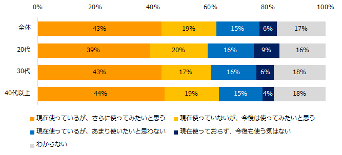 エン・ジャパンが実施した「スカウトメール意識調査」によると、全体の6割以上が今後スカウトを利用したい意向を示しており、20代・30代でその傾向が強くなっています。特に20代では「現在使っているがさらに使いたい」と「今後使ってみたい」を合わせると約9割が前向きな姿勢を持っていることがわかりました。
