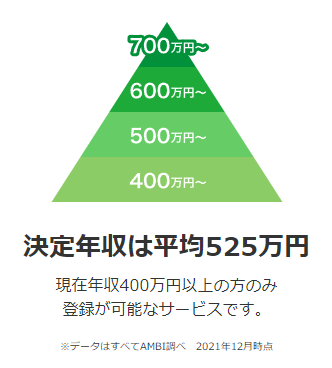 AMBIへの登録資格として、「現在年収400万円以上」という条件が設けられています。これは単なる制限ではなく、サービス全体の質を一定水準に保つためのフィルタリング機構です。その結果、登録者の平均的な転職決定年収は525万円に達しており、ミドルクラスの即戦力人材が多く集まっています。
