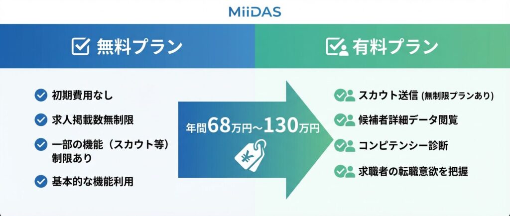 ミイダスは定額制を採用しており、スカウト送付数・求人掲載数・採用人数のいずれにも上限がありません。成果報酬型のサービスでは採用人数が増えるほど費用が膨らみますが、ミイダスでは何人採用しても追加料金が発生しないため、採用数が多い企業ほどコストメリットが大きくなる設計です。