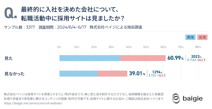スカウトを受けた候補者が次に確認するのは求人ページです。株式会社ベイジが2024年に実施した調査(n=3,317)によると、転職活動中に採用サイトを確認した求職者は全体の60.99%にのぼります(添付画像参照)。