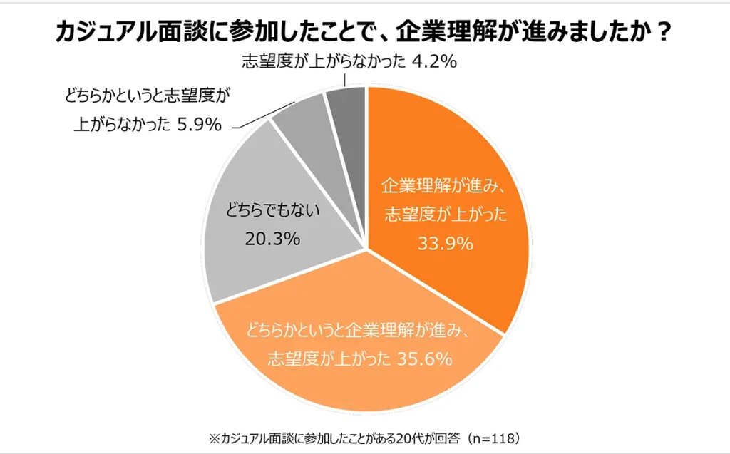 カジュアル面談は採用ブランディングの場としても機能します。hrzine.jpが実施した調査によると、カジュアル面談に参加したことで「企業理解が進み、志望度が上がった」「どちらかというと志望度が上がった」と回答した20代は合計69.5%にのぼっています。