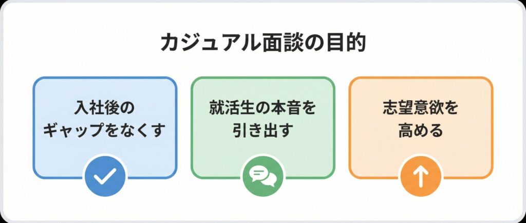 カジュアル面談は「話しやすい場」を設けること自体が目的ではなく、その背後には採用成果につながる明確な意図があります。