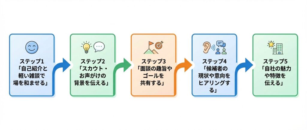 冒頭の数分間は、候補者の緊張をほぐすことだけに集中することが最優先です。担当者の名前・役職・担当業務を伝えるのはもちろん、趣味や好きな食べ物など仕事に関係のない話題も盛り込むと、一気に打ち解けやすくなります。