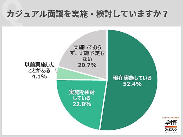 学情が実施した調査によると、カジュアル面談を「現在実施している」企業は52.4%に達しており、「実施を検討している」を合わせると約75%の企業が前向きに取り組んでいることがわかります。