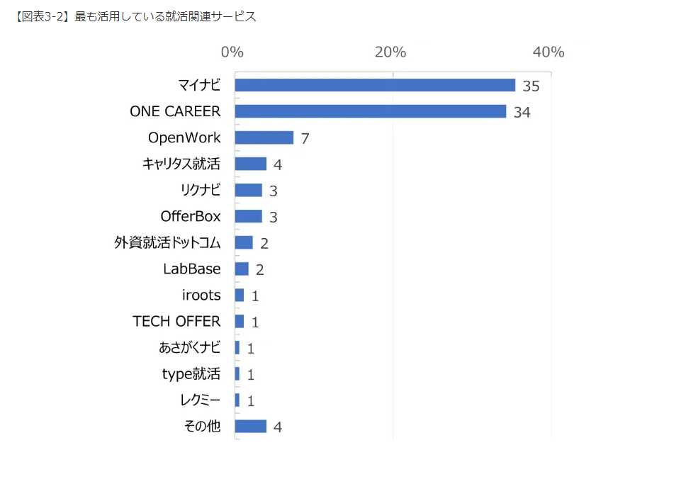HR Proが実施した「最も活用している就活関連サービス」に関する調査では、マイナビが35%でトップを獲得しています。2位のONE CAREERが34%とほぼ並んでいる一方、3位以下のOpenWork(7%)・キャリタス就活(4%)・リクナビ(3%)などと比べると、マイナビとONE CAREERが学生の就活行動を二分している構図がわかります(図表3-2参照)。