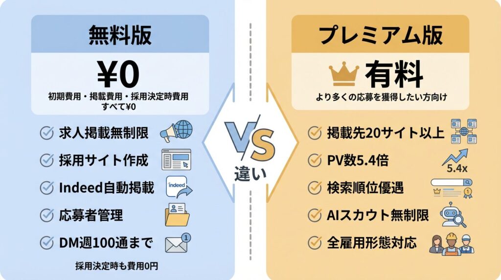 プレミアムに切り替えた場合でも、チケット制のため採用が決まった日に費用を止められる仕組みは、予算管理を重視する中小企業に向いています。「応募がきた日数分だけ払えばよい」という考え方は、定額制の求人広告と比べてコスト効率が高く、採用単価を下げやすい設計になっています。