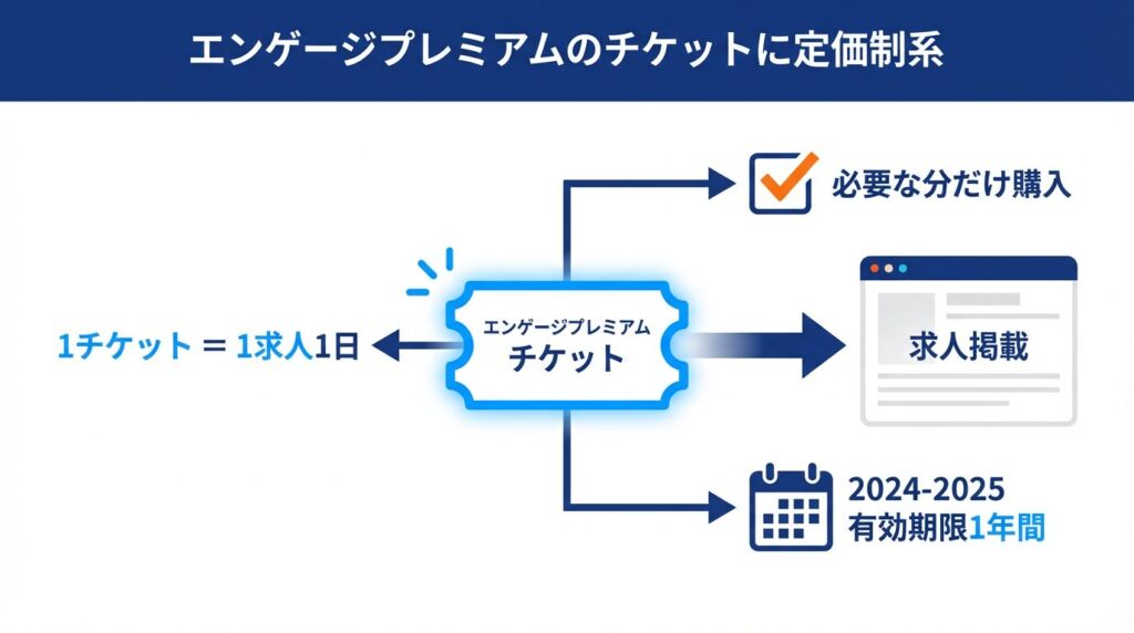 エンゲージプレミアムは「チケット消化型」という独自の料金体系を採用しています。基本ルールは「1チケット=1求人1日掲載」で、回数券のように事前に購入したチケットを1日ごとに消費していく仕組みです。