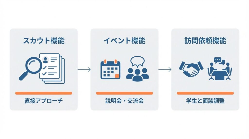 スカウトで興味を持った学生を、自社主催のイベントやインターンシップに誘導することもできます。説明会や個別面談の集客にスカウトを活用することで、採用活動の入口を広げられるのです。