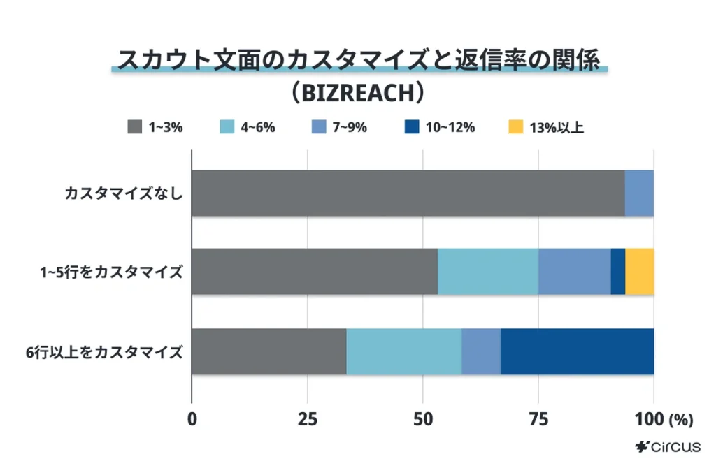 Circus社の調査によると、スカウト文面をカスタマイズする量と返信率には明確な相関があります。6行以上カスタマイズしたスカウトでは返信率10〜12%の割合が増えているのに対し、カスタマイズなしの場合はほとんどが1〜3%に留まっています。