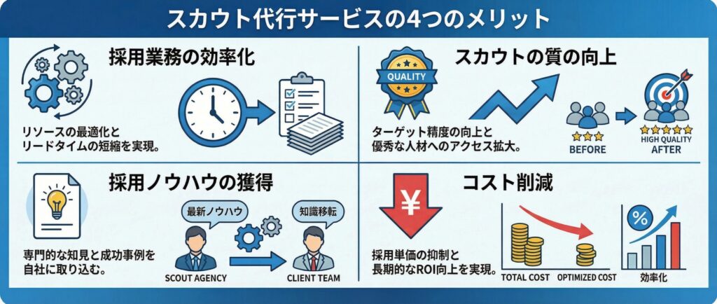 スカウト代行を利用する最大のメリットは、採用担当者の業務負担を大幅に軽減できる点です。