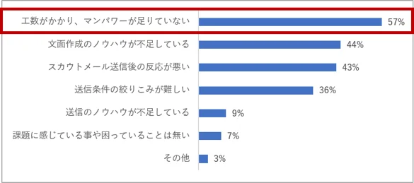 スカウト業務の現場で最も多く挙げられる課題が工数の問題です。タイプ社が実施したスカウトメールに関する調査では、「工数がかかり、マンパワーが足りていない」という回答が57%で最多となっており、2位以下の「文面作成のノウハウが不足している(44%)」「スカウトメール送信後の反応が悪い(43%)」を大きく上回っています。