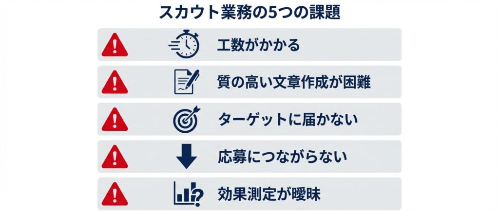 採用担当者がスカウト業務に取り組むうえで感じる課題は多岐にわたります。スカウト代行を検討する企業に共通するのは、業務上の具体的な困りごとがあるという点です。どの課題から手をつけるべきかを見極めるためにも、自社の状況と照らし合わせながら確認してください。