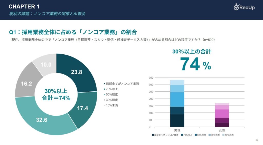 こうした負担増の背景には、日程調整やデータ入力といった「ノンコア業務」の肥大化があります。RecUpの調査(2026年)によれば、採用業務全体に占めるノンコア業務の割合が「30%以上」と回答した担当者は74%に達しており、本来注力すべき選考や戦略立案に時間を割けない実態が浮き彫りになっています。