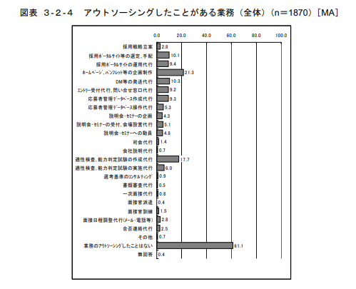 厚生労働省が公表している採用代行業務に関するデータでは、アウトソーシングを利用したことがある企業のうち、10.3%がスカウトメールの送信代行を活用していることが示されています。採用活動の外部委託が広がるなかで、スカウト業務の代行は定着しつつある選択肢のひとつです。