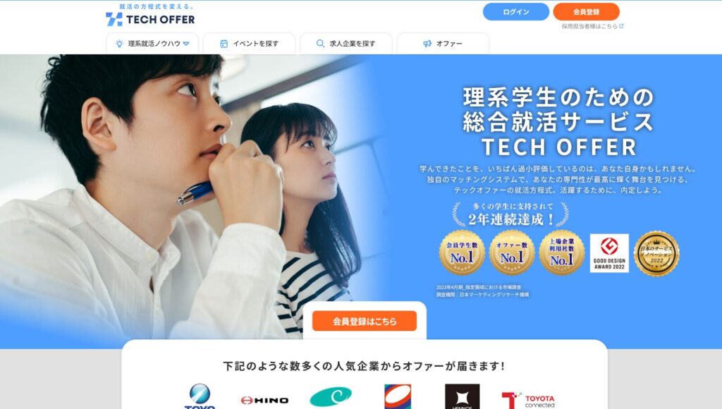 TECH OFFERは、株式会社テックオファーが運営する理工系学生向けのオファー型就活サイトです。企業からのオファーを学生が受け取る仕組みで、学生の負担を軽減しながら効率的なマッチングを実現しています。